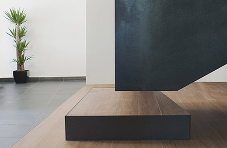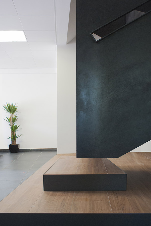 L'ampliamento si collega al piano terra per mezzo di una scala realizzata in lamiera presso-piegata rivestita in resina nera a contrasto con le pareti bianche del piano terra in mezzo alle quali “cade” dal piano primo con la sua forma scultorea a segnalare la presenza dei nuovi spazi al piano superiore.